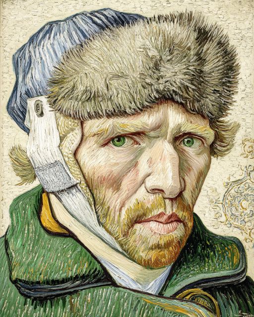 Swathed in a resilient aura of defiance and contemplation, "Self-Portrait with Bandaged Ear and Fur Cap" vividly encapsulates the profound emotional and psychological state of Vincent van Gogh post his infamous 1888 incident. This painting, marked by Van Gogh’s characteristic thick, expressive brushstrokes and poignant use of earthy greens and yellows, renders not just a man, but a poignant story etched onto canvas. The textured fur cap and the pale, taut bandage bring out a stark contrast against his haughty, yet anguished gaze. The composition and the vibrant yet subdued colors used reflect Van Gogh's emotional turbulence and his relentless pursuit of artistic expression despite personal torments. *** About the "Self-Portrait with Bandaged Ear and Fur Cap": Disclaimer: This is a digital reproduction inspired by the original artwork. It is not an official scan or photograph of the original painting.