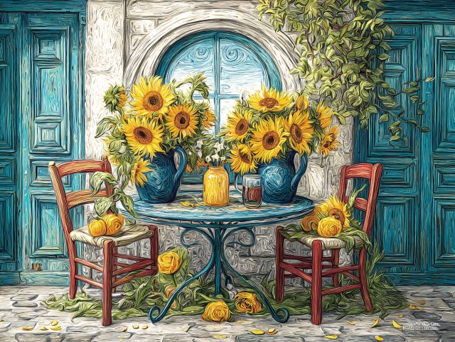 Bathed in a starlit glow, ‘Sunflowers and Starlight: Van Gogh’s Vision at the Arles Café’ captures an imaginary tableau where Vincent van Gogh’s love for vibrant sunflowers and celestial phenomena coalesce. The composition centers around a rustic café table, an intimate nook shielded by climbing vines, under the softness of twilight. On the tabletop, two robust bouquets of sunflowers stand proudly in cobalt blue vases, their golden hues fiercely alive against the serene backdrop of a star-scattered sky visible through the window. The scene exudes a sense of peaceful solitude and reflects Van Gogh’s fascination with the night sky and his iconic sunflower series. Every brushstroke articulates the emotional intensity and the painter’s longing to convey the deep connections between earth and cosmos. ***About the Sunflowers and Starlight: Van Gogh’s Vision at the Arles Café ***: This imaginative creation pays homage to elements recurrent in Van Gogh’s work during his time in Arles, France, in the late 1880s. Known for his expressive and emotive technique, Van Gogh's style is characterized by bold, dramatic brush strokes that evoke movement and emotion. This artwork intertwines motifs from his famed ‘Sunflowers’ series and the mesmerizing swirls of ‘Starry Night.’ It reflects his continuous struggle with loneliness and his quest for solace and understanding through his art. While this specific piece does not correspond to a real painting by Van Gogh and may not be located in a museum, it serves as a tribute to his artistic innovation and his ability to infuse beauty and meaning into everyday surroundings. Disclaimer: This is a digital reproduction inspired by the original artwork. It is not an official scan or photograph of the original painting.
