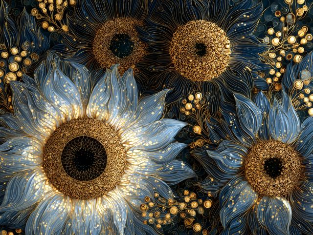 Immerse yourself in the swirling dance of intense blues and radiant golds—this reimagined work echoes Vincent van Gogh's iconic Sunflowers with an ultramodern twist. The image captivates with its deep, dynamic textures that ripple across the canvas, evoking a sensation of movement and vibrancy reminiscent of a vivid dream. Shimmering golden spirals infuse the artwork with a mesmerizing optical depth, creating an interplay of light and shadow that brings the sunflowers to life. This contemporary piece retains the emotional intensity of Van Gogh's original, blending tradition with a futuristic aesthetic influenced by designers like Ross Lovegrove and Stefan Sagmeister. The bold use of color and inventive forms invites the viewer to experience Van Gogh’s themes in an entirely new light, emphasizing innovation and the timeless appeal of nature’s beauty. Disclaimer: This is a digital reproduction inspired by the original artwork. It is not an official scan or photograph of the original painting.