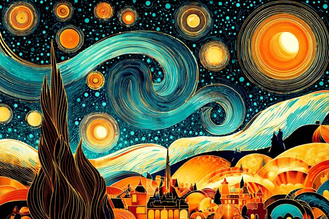 Plunged in a pool of indigo and cobalt blue, The Starry Night Over the Rhone captures the serene yet powerful essence of the night that resonated with Vincent van Gogh. Dated to early 1888 before his more turbulent Starry Night, this painting portrays the reflective waters of the Rhône River in Arles, under a sky alive with swirling celestial formations and bright bold stars. Van Gogh's fascination with nighttime scenes infuses this composition, as he encapsulates the contrasts between the dark river and the luminous sky. Luminous gas lanterns twinkle alongside the natural starlight, inferring the simultaneous existence of the mundane and the majestic. The figures of a couple are subtly included, suggesting a silent, shared contemplation of the night’s beauty. This masterwork beautifully showcases Van Gogh's pioneering use of color and texture, evident in his expressive brushstrokes that convey emotion while depicting reality. *** About The Starry Night Over the Rhone: Created in 1888 during Van Gogh’s stay in Arles, this artwork stands out as one of his most peaceful nocturnal scenes. Unlike the turmoil often depicted in his later works, this painting exudes calm and reflects Van Gogh's fascination with the nocturnal views that he observed during his walks along the river bank. The Starry Night Over the Rhone is a poignant exploration of harmony and human connection under the cosmos. Van Gogh's technique in this painting emphasizes thick impasto brushstrokes that give texture and vibrancy to the night sky. The artwork today is housed in the Musée d'Orsay in Paris and continues to enchant viewers with its captivating portrayal of light and reflection. Disclaimer: This is a digital reproduction inspired by the original artwork. It is not an official scan or photograph of the original painting.