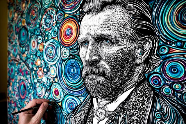 Drenched in vibrant swirls that mimic the chaotic beauty of the cosmos, "Van Gogh Amidst Swirling Colors of Creative Turmoil" captures the intensity of the famed painter's own emotional and creative storms. This visually electric artwork portrays Vincent Van Gogh as if stepping right out of his era into a fantastical realm of color and pattern. Here, Van Gogh's visage, marked by the craggy lines and thoughtful eyes well-known from his self-portraits, is set against a backdrop of mesmerizing color spirals that suggest a deep, internal universe bursting forth. The artist’s expression, steeped in contemplation, perhaps mirrors his arduous journey through mental anguish and brilliant artistic creation. This piece not only immortalizes Van Gogh’s iconic look but also encapsulates the essence of his struggle and genius in a contemporary stylized form. *** About "Van Gogh Amidst Swirling Colors of Creative Turmoil": Disclaimer: This is a digital reproduction inspired by the original artwork. It is not an official scan or photograph of the original painting.
