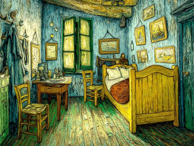 Steeped in vivid colors and emotional richness, "Van Gogh's Bedroom in Arles" offers a deeply personal glimpse into the private world of Vincent van Gogh. The painting is vibrant with brilliant blues and yellows, its surface animated by Van Gogh's distinctive brushwork. Every stroke and color choice serves to convey a sense of solace and solitude, perhaps reflecting the artist's search for peace amidst mental turmoil. This artwork not only showcases Van Gogh's skill in using colors to evoke emotions but also reveals his ability to transform an ordinary scene into something extraordinary. The carefully arranged furniture, the open window, and the paintings hanging on the walls tell a story of a life that yearns for stability and comfort. In this bedroom, Van Gogh’s chaotic thoughts found a resting place, as the room served both as a sanctuary and a canvas, reflecting his personal struggles and artistic genius. *** About the Bedroom in Arles: Vincent van Gogh painted "The Bedroom" in October 1888 while he was living in the Yellow House in Arles. This work is renowned for its bold use of color and a perspective that invites the viewer to step into Van Gogh’s private space. The room represented in the painting was not just a sleeping quarter but an area where Van Gogh also worked, and it showcases his minimalistic yet functional style. Evidently, each object in the room was chosen with care, serving both aesthetic and practical purposes. Van Gogh’s intention was to express tranquility with the artwork, a significant theme given his tumultuous life. The painting is particularly famous for its unique perspective and the distortions that contribute to a sense of intimacy and confined space. Van Gogh created three versions of this painting; the one discussed here is typically known as the first version, which can be viewed at the Van Gogh Museum in Amsterdam. The work encapsulates elements of the Post-Impressionist movement, which is characterized by expressive color, emotive subject matter, and a departure from the precise realism of the Impressionists. Van Gogh's innovative techniques and his emotional candor make this painting a poignant reflection of his life and art. Disclaimer: This is a digital reproduction inspired by the original artwork. It is not an official scan or photograph of the original painting.
