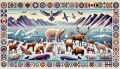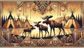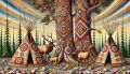 Evocative First Nation-inspired Landscape with Tipis and Elk Amid Snowy Mountains