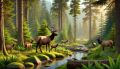 Illuminated Elk and Calf in a Serene Forest of Light and Shadow