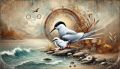 Surreal Coastal Elegance: Herring Gull and Chicks Among Swirled Vistas
