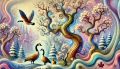 Enigmatic Journey of Loon Family: A Surreal Cubist Landscape