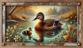 Tranquil Dawn: Mother Mallard and Chick Amidst Autumn Splendor