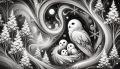 Enchanted Winter Realm: A Snowy Owl and Chicks Amid Whirls of Magic