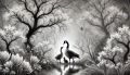 Enchanting Monochrome Vista: Geese Family Amidst Spring Blossoms