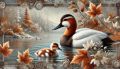 Canvasback Ducks in a Misty Canadian Lake Surrounded by Autumn Leaves