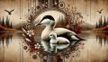 Serene Reflections: Common Eider and Chick Amid Nature’s Art
