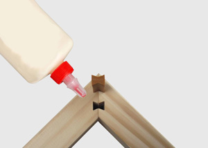 Whilst keeping the mouldings pressed together, grab your wood glue and add a little bit of glue to the inside of the bowtie shaped keyway. Then press your first key into the keyway, which will then hold the frame together. |