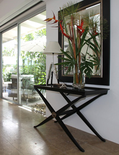 A mirror is the front hall can bring in light to an often dimly lit area, and provide a welcoming air. Place a mirror with a slim antiqued moulding behind an end table with a plant or vase display.