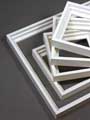 This stair step floating canvas frame has a matte white finish. The canvas will hover neatly, resting on the lowest, flat edge.